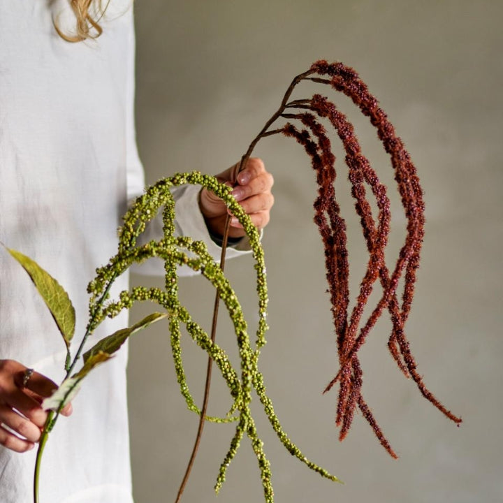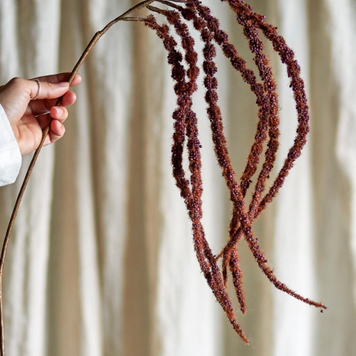 Cette tige décorative Foxtail se distingue par ses grappes tombantes de petites fleurs brun-rouge. Son apparence douce et sa silhouette organique apportent du relief et de la sophistication à tout arrangement floral. Utilisez-la seule dans un vase ou combinez-la à d'autres fleurs artificielles pour créer une composition raffinée. Sa tige flexible peut être modelée pour s’adapter à la forme du vase ou à l’ambiance souhaitée.